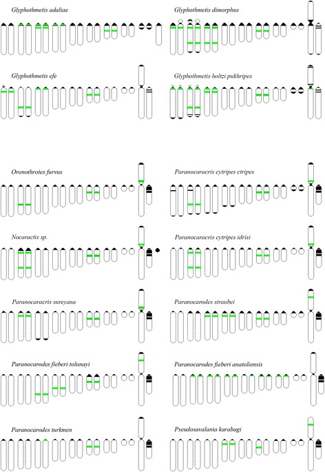 Results: The basal karyotype for the Pamphagidae family, consisting of 18 acrocentric autosomes and an acrocentric X chromosome (2n♂ = 19, X0; 2n♀ = 20, XX), was found only in G. adaliae. The karyotype of all other studied species consisted of 16 acrocentric autosomes and a neo-XY sex chromosome system (2n♂♀ = 18, neo-XX♀/neo-XY♂). Two different types of neo-Y chromosomes were found. One of them was typical for three species of the Glyphotmethis genus, and showed a neo-Y chromosome being similar in size to the XR arm of the neo-X, with the addition of two small subproximal interstitial C-blocks. The second type of the neo-Y chromosome was smaller and more heterochromatinized than the XR arm, and was typical for all Nocarodeini species studied. The chromosome distribution of C-positive regions and clusters of ribosomal DNA (rDNA) and telomeric repeats yielded additional information on evolution of these neo-XY systems.