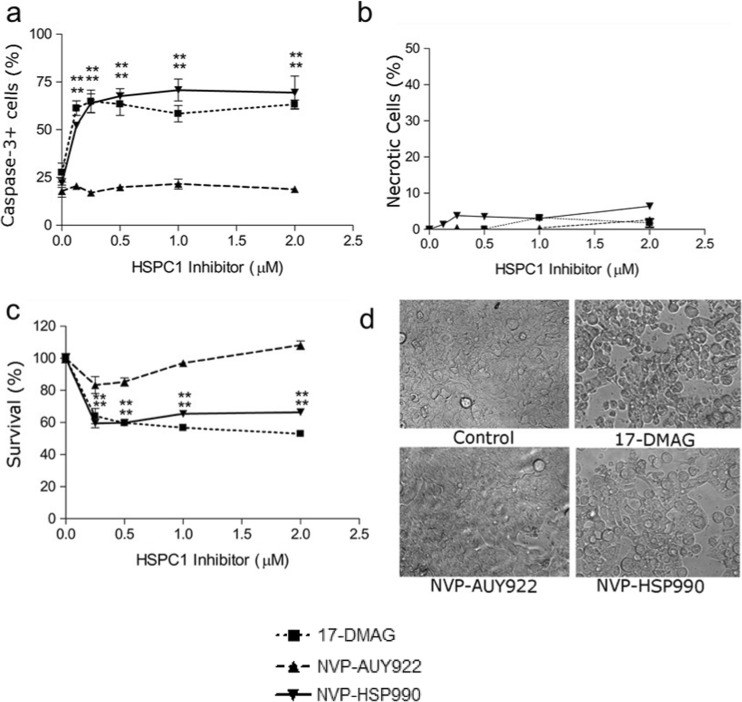 HSPC1 is a critical protein in cancer development and progression, including colorectal cancer (CRC). However, clinical trial data reporting the effectiveness of HSPC1 inhibitors on several cancer types has not been as successful as predicted. Furthermore, some N-terminal inhibitors appear to be much more successful than others despite similar underlying mechanisms. This study involved the application of three N-terminal HSPC1 inhibitors, 17-DMAG, NVP-AUY922 and NVP-HSP990 on CRC cells. The effects on client protein levels over time were examined. HSPC1 inhibitors were also applied in combination with chemotherapeutic agents commonly used in CRC treatment (5-fluorouracil, oxaliplatin and irinotecan). As HSPA1A and HSPB1 have anti-apoptotic activity, gene-silencing techniques were employed to investigate the significance of these proteins in HSPC1 inhibitor and chemotherapeutic agent resistance. When comparing the action of the three HSPC1 inhibitors, there are distinct differences in the time course of important client protein degradation events. The differences between HSPC1 inhibitors were also reflected in combination treatment-17-DMAG was more effective compared with NVP-AUY922 in potentiating the cytotoxic effects of 5-fluorouracil, oxaliplatin and irinotecan. This study concludes that there are distinct differences between N-terminal HSPC1 inhibitors, despite their common mode of action. Although treatment with each of the inhibitors results in significant induction of the anti-apoptotic proteins HSPA1A and HSPB1, sensitivity to HSPC1 inhibitors is not improved by gene silencing of HSPA1A or HSPB1. HSPC1 inhibitors potentiate the cytotoxic effects of chemotherapeutic agents in CRC, and this approach is readily available to enter clinical trials. From a translational point of view, there may be great variability in sensitivity to the inhibitors between individual patients.