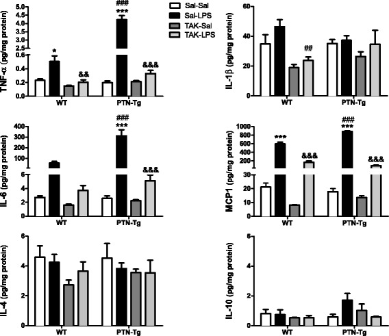 Results: We found that LPS-induced microglial activation is significantly increased in the PFC of PTN-Tg mice compared to that of WT mice. The levels of TNF-α, IL-6, and MCP-1 in response to LPS were significantly increased in the PFC of PTN-Tg mice compared to that of WT mice. Pretreatment with TAK-242 efficiently blocked increases in cytokine contents in a similar manner in both genotypes. Concomitant incubation of BV2 cells with LPS and PTN significantly potentiated the production of NO compared to cells only treated with LPS.