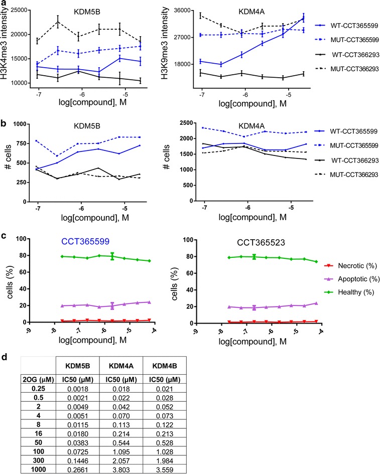 Results: A panel of assays for the Jumonji C subfamily of KDMs was developed to encompass all major branches of the JmjC phylogenetic tree. These assays compare compound activity against wild-type KDM proteins to a catalytically inactive version of the KDM, in which residues involved in the active-site iron coordination are mutated to inactivate the enzyme activity. These mutants are critical for assessing the specific effect of KDM inhibitors and for revealing indirect effects on histone methylation status. The reported assays make use of ectopically expressed demethylases, and we demonstrate their use to profile several recently identified classes of KDM inhibitors and their structurally matched inactive controls. The generated data correlate well with assay results assessing endogenous KDM inhibition and confirm the selectivity observed in biochemical assays with isolated enzymes. We find that both cellular permeability and competition with 2-oxoglutarate affect the translation of biochemical activity to cellular inhibition.