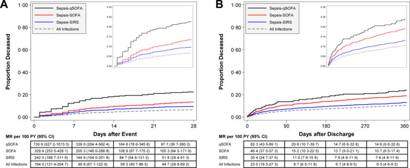 Findings: Of 2593 first infection events, 1526 met SIRS criteria, 1080 met SOFA criteria, and 378 met qSOFA criteria. Incidence was 8·2 events (95% CI 7·8-8·7) per 1000 person-years for SIRS, 5·8 events (5·4-6·1) per 1000 person-years for SOFA, and 2·0 events (1·8-2·2) per 1000 person-years for qSOFA. In-hospital mortality was higher for patients with an elevated qSOFA score (67 [23%] of 295 patients died) than for those with an elevated SOFA score (125 [13%] of 960 patients died) or who met SIRS criteria (128 [9%] of 1392 patients died). Mortality at 1 year after discharge was also highest for patients with an elevated qSOFA score (29·4 deaths [95% CI 22·3-38·7] per 100 person-years) compared with those with an elevated SOFA score (22·6 deaths [19·2-26·6] per 100 person-years) or those who met SIRS criteria (14·7 deaths [12·5-17·2] per 100 person-years).
