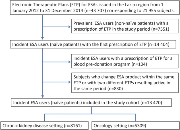 Setting: All residents in the Lazio Region, Italy, with chronic kidney disease (CKD) or cancer retrieved from the Electronic Therapeutic Plan (ETP) Register for ESA between 2012 and 2014.