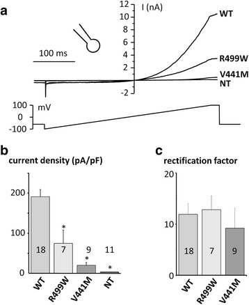 Results: Four TRPM4 variants (2.2% of the cohort) were found to change highly conserved amino-acids and were either very rare or absent from control populations. Therefore, these four TRPM4 variants were predicted to be disease causing. Furthermore, no mutations were found in the DNA of these TRPM4 variant carriers in any of the 13 major long QT syndrome genes. Two of these variants were further studied by electrophysiology (p.Val441Met and p.Arg499Pro). Both variants showed a classical TRPM4 outward rectifying current, but the current was reduced by 61 and 90% respectively, compared to wild type TRPM4 current.