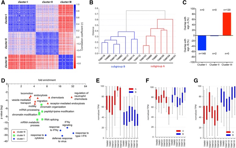 Background: Although tumor-associated macrophages (TAMs) are essential for cancer progression, connections between different clinical outcomes and transcriptional networks have not been reported. We have addressed this issue by analyzing global expression patterns of TAMs isolated from the ascites of ovarian cancer patients.