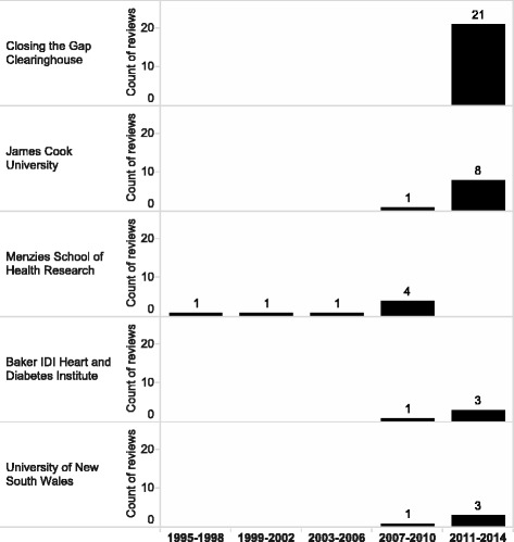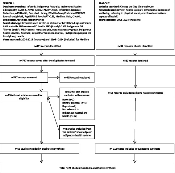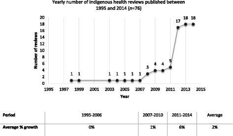 Results: Seventy-six reviews were included; comprising 55 journal articles and 21 Australian Government commissioned evidence review reports. While reviews are gaining prominence and recognition in Indigenous health research and increasing in number, breadth and complexity, there is little reporting of the impact of health research for Indigenous people. This finding raises questions about the relevance of these reviews for Indigenous people, their impact on policy and practice and how reviews have been commissioned, reported and evaluated.