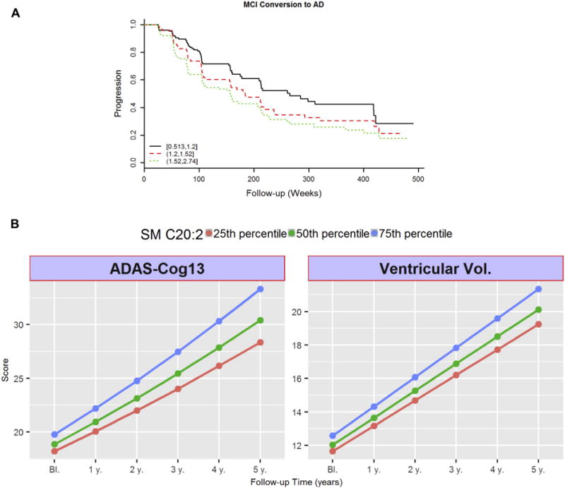 Methods: Fasting serum samples from the Alzheimer's Disease Neuroimaging Initiative (199 control, 356 mild cognitive impairment, and 175 AD participants) were analyzed using the AbsoluteIDQ-p180 kit. Performance was validated in blinded replicates, and values were medication adjusted.