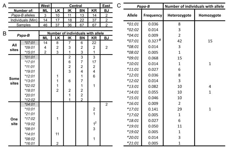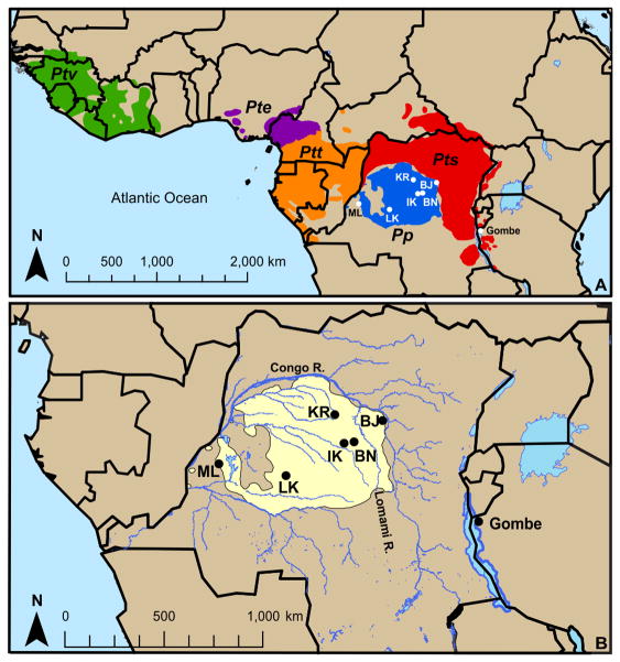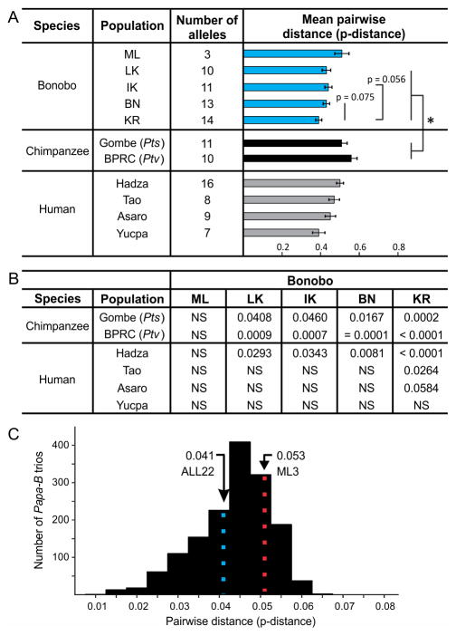 Fast-evolving MHC class I polymorphism serves to diversify NK cell and CD8 T cell responses in individuals, families, and populations. Because only chimpanzee and bonobo have strict orthologs of all HLA class I, their study gives unique perspectives on the human condition. We defined polymorphism of Papa-B, the bonobo ortholog of HLA-B, for six wild bonobo populations. Sequences for Papa-B exon 2 and 3 were determined from the genomic DNA in 255 fecal samples, minimally representing 110 individuals. Twenty-two Papa-B alleles were defined, each encoding a different Papa-B protein. No Papa-B is identical to any chimpanzee Patr-B, human HLA-B, or gorilla Gogo-B. Phylogenetic analysis identified a clade of MHC-B, defined by residues 45-74 of the α1 domain, which is broadly conserved among bonobo, chimpanzee, and gorilla. Bonobo populations have 3-14 Papa-B allotypes. Three Papa-B are in all populations, and they are each of a different functional type: allotypes having the Bw4 epitope recognized by killer cell Ig-like receptors of NK cells, allotypes having the C1 epitope also recognized by killer cell Ig-like receptors, and allotypes having neither epitope. For population Malebo, these three Papa-B are the only Papa-B allotypes. Although small in number, their sequence divergence is such that the nucleotide diversity (mean proportional distance) of Papa-B in Malebo is greater than in the other populations and is also greater than expected for random combinations of three Papa-B Overall, Papa-B has substantially less diversity than Patr-B in chimpanzee subspecies and HLA-B in indigenous human populations, consistent with bonobo having experienced narrower population bottlenecks.
