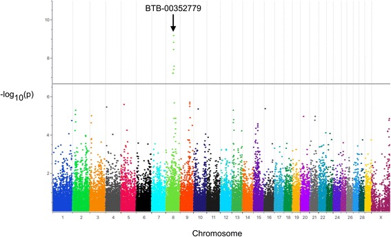 Results: Affected animals did not reveal any ophthalmological or neurological abnormalities besides the specific iris color differences. Coat color of affected cattle did not differ from controls. Histological examination revealed a reduction of melanin pigment in the iridal anterior border layer and stroma in cases as cause of iris hypopigmentation. To analyze the genetics of the iris pigmentation differences, a genome-wide association study was performed using Illumina BovineSNP50 BeadChip genotypes of the 18 cases and 172 randomly chosen control animals. A significant association on bovine chromosome 8 (BTA8) was identified at position 60,990,733 with a -log10(p) = 9.17. Analysis of genotypic and allelic dependences between cases of iridal hypopigmentation and an additional set of 316 randomly selected Holstein Friesian cattle controls showed that allele A at position 60,990,733 on BTA8 (P = 4.0e-08, odds ratio = 6.3, 95% confidence interval 3.02-13.17) significantly increased the chance of iridal hypopigmentation.