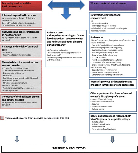 Results: Twenty-four papers drawing on twenty studies met the inclusion criteria. The synthesis identified support for the key framework themes. Women's experiences of choosing or deciding where to give birth were influenced by whether they received information about available options and about the right to choose, women's preferences for different services and their attributes, previous birth experiences, views of family, friends and health care professionals and women's beliefs about risk and safety. The synthesis additionally identified that women's access to choice of place of birth during the antenatal period varied. Planning to give birth in OU was straightforward, but although women considering birth in a setting other than hospital OU were sometimes well-supported, they also encountered obstacles and described needing to 'counter the negativity' surrounding home birth or birth in midwife-led settings.