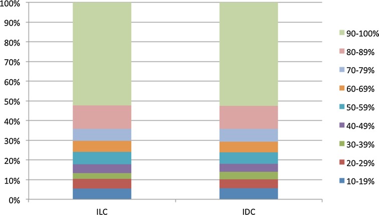 Conclusion: Patients with ER and PR-positive ILC and IDC have similar quantitative ER and PR expression profiles, implicating that ER/PR expression is unlikely to be a confounding factor in studies concerning chemo-sensitivity of ILC and IDC.