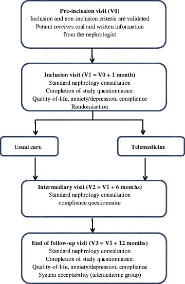 Methods: eNephro is a pragmatic randomised controlled trial, comparing home telemonitoring versus usual care in three populations of CKD patients: stage 3B/4 (n = 320); stage 5D CKD on dialysis (n = 260); stage 5 T CKD treated with transplantation (n= 260). Five hospitals and three not-for-profit providers managing self-care dialysis situated in three administrative regions in France are participating. The trial began in December 2015, with a scheduled 12-month inclusion period and 12 months follow-up. Outcomes include clinical and biological data (e.g. blood pressure, haemoglobin) collected from patient records, perceived health status (e.g. health related quality of life) collected from self-administered questionnaires, and health expenditure data retrieved from the French health insurance database (SNIIRAM) using a probabilistic matching procedure.