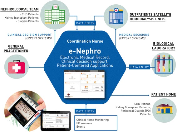 Background: Home telemonitoring has developed considerably over recent years in chronic diseases in order to improve communication between healthcare professionals and patients and to promote early detection of deteriorating health status. In the nephrology setting, home telemonitoring has been evaluated in home dialysis patients but data are scarce concerning chronic kidney disease (CKD) patients before and after renal replacement therapy. The eNephro study is designed to assess the cost effectiveness, clinical/biological impact, and patient perception of a home telemonitoring for CKD patients. Our purpose is to present the rationale, design and organisational aspects of this study.