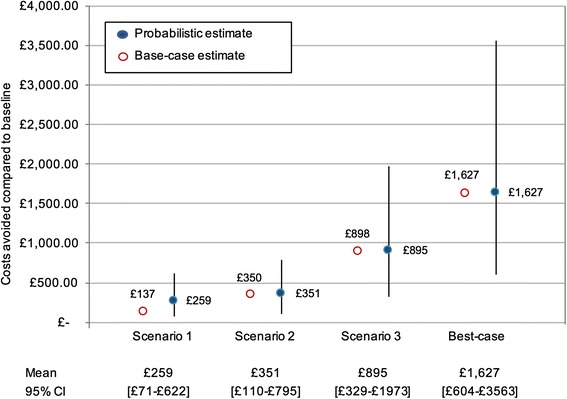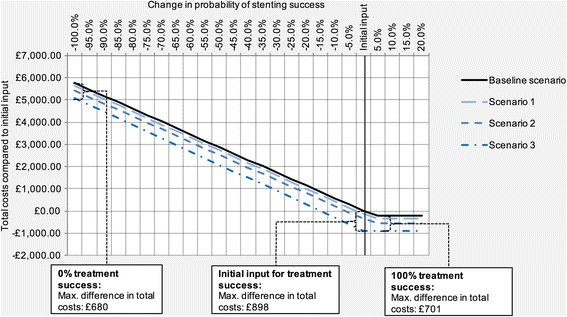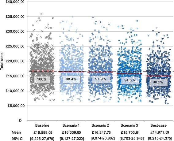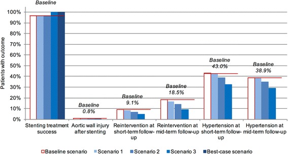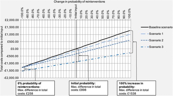 Results: Baseline costs were £16 688 ($25 182) per patient. Avoidable costs ranged from £137 ($207) per patient in a scenario assuming a 10% reduction in aortic wall injuries and reinterventions at follow-up, to £1627 ($2455) in a Best-case scenario with 100% treatment success and no complications. Overall costs in the Best-case scenario were 90.2% of overall costs at Baseline. Reintervention rate at follow-up was identified as most influential lever for overall costs. Probabilistic sensitivity analysis showed a considerable degree of uncertainty for avoidable costs with widely overlapping 95% confidence intervals.