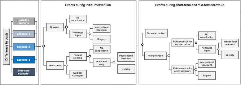 Methods: We developed an economic model to calculate potentially avoidable costs in stenting treatment of CoA in the United Kingdom over 5 years. We calculated baseline costs for the intervention and potentially avoidable complications and follow-up interventions and compared these to the costs in hypothetical scenarios with improved treatment effectiveness and complication rates.