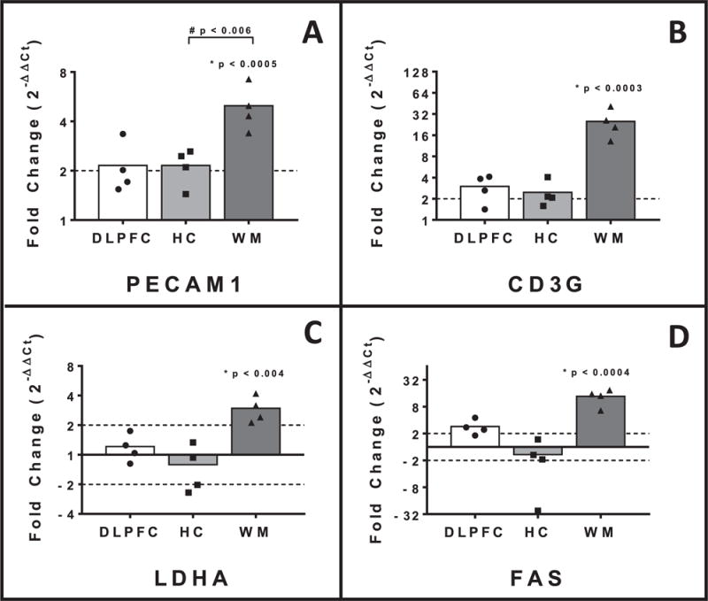 Fractionated whole-brain irradiation (fWBI) is a mainstay of treatment for patients with intracranial neoplasia; however late-delayed radiation-induced normal tissue injury remains a major adverse consequence of treatment, with deleterious effects on quality of life for affected patients. We hypothesize that cerebrovascular injury and remodeling after fWBI results in ischemic injury to dependent white matter, which contributes to the observed cognitive dysfunction. To evaluate molecular effectors of radiation-induced brain injury (RIBI), real-time quantitative polymerase chain reaction (RT-qPCR) was performed on the dorsolateral prefrontal cortex (DLPFC, Brodmann area 46), hippocampus and temporal white matter of 4 male Rhesus macaques (age 6-11 years), which had received 40 Gray (Gy) fWBI (8 fractions of 5 Gy each, twice per week), and 3 control comparators. All fWBI animals developed neurologic impairment; humane euthanasia was elected at a median of 6 months. Radiation-induced brain injury was confirmed histopathologically in all animals, characterized by white matter degeneration and necrosis, and multifocal cerebrovascular injury consisting of perivascular edema, abnormal angiogenesis and perivascular extracellular matrix deposition. Herein we demonstrate that RIBI is associated with white matter-specific up-regulation of hypoxia-associated lactate dehydrogenase A (LDHA) and that increased gene expression of fibronectin 1 (FN1), SERPINE1 and matrix metalloprotease 2 (MMP2) may contribute to cerebrovascular remodeling in late-delayed RIBI. Additionally, vascular stability and maturation associated tumor necrosis super family member 15 (TNFSF15) and vascular endothelial growth factor beta (VEGFB) mRNAs were increased within temporal white matter. We also demonstrate that radiation-induced brain injury is associated with decreases in white matter-specific expression of neurotransmitter receptors SYP, GRIN2A and GRIA4. We additionally provide evidence that macrophage/microglial mediated neuroinflammation may contribute to RIBI through increased gene expression of the macrophage chemoattractant CCL2 and macrophage/microglia associated CD68. Global patterns in cerebral gene expression varied significantly between regions examined (P < 0.0001, Friedman's test), with effects most prominent within cerebral white matter.
