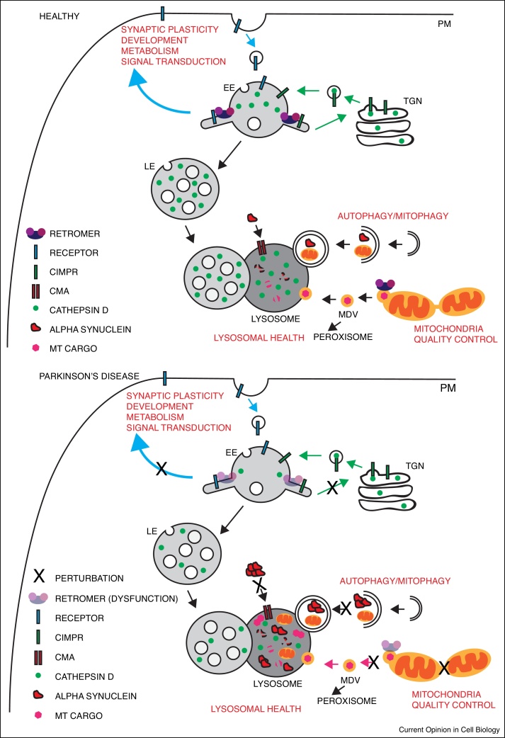 Efficient sorting and transportation of integral membrane proteins, such as ion channels, nutrient transporters, signalling receptors, cell-cell and cell-matrix adhesion molecules is essential for the function of cellular organelles and hence organism development and physiology. Retromer is a master controller of integral membrane protein sorting and transport through one of the major sorting station within eukaryotic cells, the endosomal network. Subtle de-regulation of retromer is an emerging theme in the pathoetiology of Parkinson's disease. Here we summarise recent advances in defining the neuroprotective role of retromer and how its de-regulation may contribute to Parkinson's disease by interfering with: lysosomal health and protein degradation, association with accessory proteins including the WASH complex and mitochondrial health.