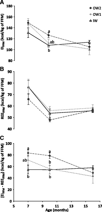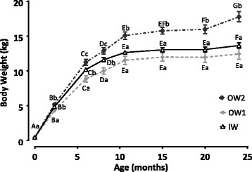 Results: At 24 months, the group compositions were in line with the body condition scores (BCS 1-9) values of the IW (5 or 6/9), the OW1 (6/9) and the OW2 (7 or 8/9) groups. Logistic regression analysis permitted the identification of neonatal growth rate during the first 2 weeks of life (GR2W) and BCS at 7 months as predictors for the development of obesity at adulthood. Seventy percent of dogs with either GR2W >125% or with BCS > 6/9 at 7 months belonged to the OW2 group. Results from energy intake and expenditure, corrected for FFM, showed that there was a greater positive energy imbalance between 7 and 10 months for the OW2, compared to the IW group.