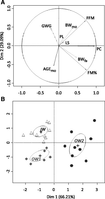 Background: The risks during early growth on becoming overweight in adulthood are widely studied in humans. However, early-life predictive factors for canine adult overweight and obesity have not yet been studied. To identify factors that may help explain the development of overweight and obesity at adulthood in dogs, a longitudinal study of 2 years was conducted in 24 female Beagle dogs of the same age, sexual status, and raised under identical environmental conditions. By means of a hierarchical classification on principal components with the following quantitative values: fat-free mass (FFM), percentage fat mass and pelvic circumference at 2 years of age, three groups of dogs were established and were nominally named: ideal weight (IW, n = 9), slightly overweight (OW1, n = 6) and overweight (OW2, n = 9). With the aim of identifying predictive factors of development of obesity at adulthood parental characteristics, growth pattern, energy balance and plasma factors were analysed by logistic regression analysis.