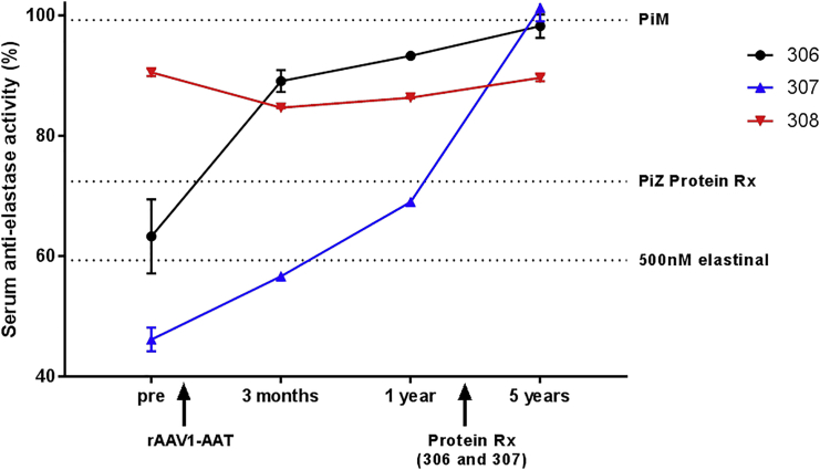 Alpha-1 antitrypsin deficiency is a monogenic disorder resulting in emphysema due principally to the unopposed effects of neutrophil elastase. We previously reported achieving plasma wild-type alpha-1 antitrypsin concentrations at 2.5%-3.8% of the purported therapeutic level at 1 year after a single intramuscular administration of recombinant adeno-associated virus serotype 1 alpha-1 antitrypsin vector in alpha-1 antitrypsin deficient patients. We analyzed blood and muscle for alpha-1 antitrypsin expression and immune cell response. We also assayed previously reported markers of neutrophil function known to be altered in alpha-1 antitrypsin deficient patients. Here, we report sustained expression at 2.0%-2.5% of the target level from years 1-5 in these same patients without any additional recombinant adeno-associated virus serotype-1 alpha-1 antitrypsin vector administration. In addition, we observed partial correction of disease-associated neutrophil defects, including neutrophil elastase inhibition, markers of degranulation, and membrane-bound anti-neutrophil antibodies. There was also evidence of an active T regulatory cell response (similar to the 1 year data) and an exhausted cytotoxic T cell response to adeno-associated virus serotype-1 capsid. These findings suggest that muscle-based alpha-1 antitrypsin gene replacement is tolerogenic and that stable levels of M-AAT may exert beneficial neutrophil effects at lower concentrations than previously anticipated.