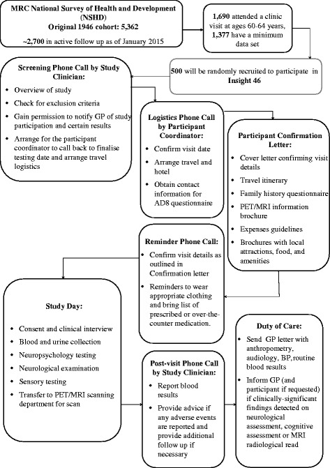 Methods/design: This paper outlines the clinical, cognitive and imaging protocol of "Insight 46", a neuroscience sub-study of the MRC National Survey of Health and Development. This is one of the oldest British birth cohort studies and has followed 5362 individuals since their birth in England, Scotland and Wales during one week in March 1946. These individuals have been tracked in 24 waves of data collection incorporating a wide range of health and functional measures, including repeat measures of cognitive function. Now aged 71 years, a small fraction have overt dementia, but estimates suggest that ~1/3 of individuals in this age group may be in the preclinical stages of Alzheimer's disease. Insight 46 is recruiting 500 study members selected at random from those who attended a clinical visit at 60-64 years and on whom relevant lifecourse data are available. We describe the sub-study design and protocol which involves a prospective two time-point (0, 24 month) data collection covering clinical, neuropsychological, β-amyloid positron emission tomography and magnetic resonance imaging, biomarker and genetic information. Data collection started in 2015 (age 69) and aims to be completed in 2019 (age 73).