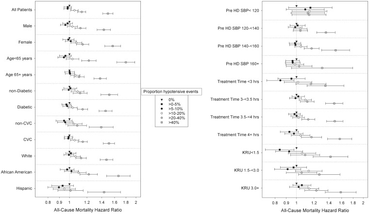 Background: Intradialytic hypotension (IDH) occurs frequently in maintenance hemodialysis (HD) patients and may be associated with higher mortality. We hypothesize that nadir intradialytic systolic blood pressure (niSBP) is inversely related to death risk while iSBP change (Δ) and IDH frequency are incrementally associated with all-cause mortality.