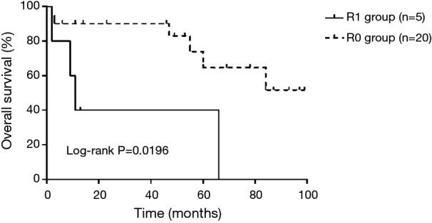 Results: Twenty of 25 (80%) patients with invasive thymoma underwent complete resection of the tumor along with vessel reconstruction. Intraoperatively, different types of operation were conducted, namely, brachiocephalic vein (BCV)-right atrial appendage (RAA) reconstruction in 11 cases, complex vessel reconstruction (more than one graft) in 1 case and superior vena cava (SVC)-SVC reconstruction in the remaining cases. Ringed polytetrafluoroethylene (PTFE) grafts were used for vessel reconstruction. Postoperatively, three cases suffered from pulmonary infection, and three cases had haemothorax, chylothorax and atelectasis, respectively. Two patients died due to acute respiratory distress syndrome within 90 days after the surgery. Within the remaining patients, 11 cases (44%) experienced a relapse and finally 8 (32%) patients died. Compared to R1 resection group, R0 resection group had a better prognosis (Log-rank P=0.0196). The 3- and 5-year survival rates were 79.6% and 59.1%, with median survival time of 84 months.