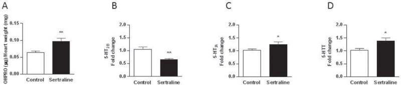 Selective serotonin reuptake inhibitors are prescribed to 6%-10% of pregnant women in the United States. Using an intrauterine plus neonatal exposure model to represent exposure throughout human pregnancy, we hypothesized sertraline exposure would impact intracardiac serotonin signaling and lead to small left heart syndrome in the absence of maternal psychopathology. C57BL/6 adult female mice received sertraline (5 mg·kg·d IP) or saline throughout pregnancy to time of delivery. Pups maintained exposure on postnatal days 1-14 to encompass the developmental window analogous to human gestation. Sertraline-exposed mice had increased cardiac hydroxyproline content, decreased 5-HT2B receptor mRNA levels, and increased 5-HT2A receptor and serotonin transporter mRNA levels on postnatal day 21 (P < 0.05). These changes were associated with diminished exercise capacity at 6 weeks (P < 0.05) and decreased adult shortening fraction and stroke volume at 5 months. Isolated cardiomyocytes from neonatal sertraline-exposed mice had significantly decreased proliferation, cross-sectional area, and phosphorylation of Akt (P < 0.05 vs. neonatal control mice). Perinatal sertraline exposure alters neonatal cardiac development and produces long-standing changes in adult cardiac function and exercise capacity. Further studies are needed to assess whether similar findings are present in the growing population that has been exposed to selective serotonin reuptake inhibitors during development.