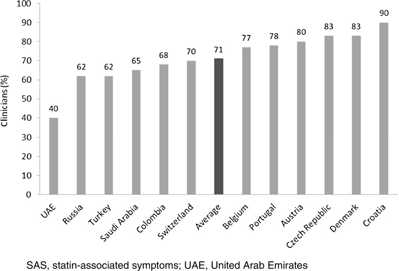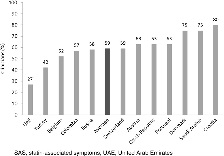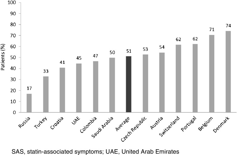 Results: Muscle-related symptoms were the most common presentation of potential SAS (average: 51%; range across countries [RAC] 17-74%); other signs/symptoms included persistent elevation in transaminases. To establish whether symptoms are due to statins, clinicians required rechallenge after discontinuation of statin treatment (average: 77%; RAC 40-90%); other requirements included trying at least one alternative statin. Clinicians reported that half of high-risk patients with confirmed SAS receive a lower-dose statin (average: 53%; RAC 43-72%), and that most receive another non-statin lipid-lowering therapy with or without a concomitant statin (average: 65%; RAC 52-83%).