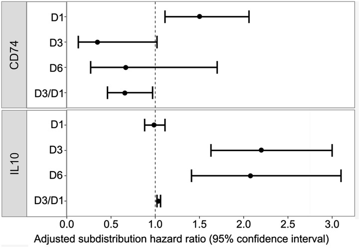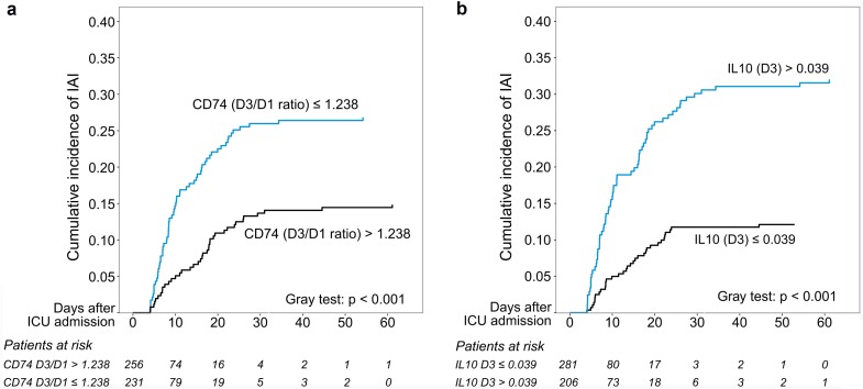 Results: A total of 725 patients were analyzed. At least one IAI episode occurred in 137 patients (19%). After adjustment for shock and sepsis status at admission, CD74 and IL10 levels were found to be significantly associated with IAI occurrence [subdistribution hazard ratio (95% confidence interval) 0.67 (0.46-0.97) for CD74 D3/D1 expression ratio and 2.21 (1.63-3.00) for IL10 at D3]. IAI cumulative incidence was significantly different between groups stratified according to CD74 or IL10 expression (Gray tests p < 0.001).