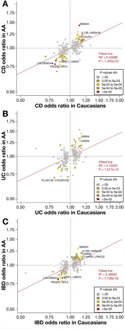 BACKGROUND & AIMS: The inflammatory bowel diseases (IBD) ulcerative colitis (UC) and Crohn’s disease (CD) cause significant morbidity and are increasing in prevalence among all populations, including African Americans. More than 200 susceptibility loci have been identified in populations of predominantly European ancestry, but few loci have been associated with IBD in other ethnicities.