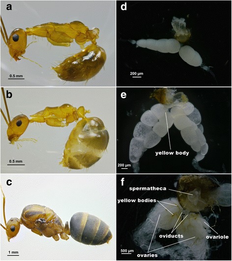 Conclusion: We propose that adaptive advantages derived from worker reproduction for A. gracilipes may include 1) trophic eggs provisioned by physogastric workers likely assist colonies of A. gracilipes in overcoming unfavorable conditions such as paucity of food during critical founding stage; 2) worker-produced males are fertile and thus might offer an inclusive fitness advantage for the doomed orphaned colony.