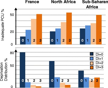 Results: Attendance at prenatal care was poor for 23.3% of the study population. Crude relative risks and confidence intervals for inadequate PCU were 1.6 [1.5-1.8], 2.3 [2.1-2.6], and 3.1 [2.8-3.4], for women with a deprivation index of 1, 2, and 3, respectively, compared to women with deprivation index of 0. Each of the four deprivation variables was significantly associated with an increased risk of inadequate PCU. Because of the interaction observed between inadequate PCU and mother's country of birth, we stratified for the latter before the multivariate analysis. After adjustment for the potential confounders, this social gradient remained for women born in France and North Africa. The prevalence of inadequate PCU among women born in sub-Saharan Africa was 34.7%; the social gradient in this group was attenuated and no longer significant. Other factors independently associated with inadequate PCU were maternal age, recent immigration, and unplanned or unwanted pregnancy.