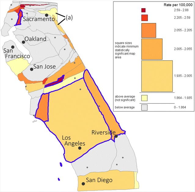 - California Cancer Registry. Age-adjusted invasive cancer incidence rates by county in California, 2009–2013. Based on December 2015 Extract. http://cancer-rates.info/ca/. Accessed on Jun 19, 2016.