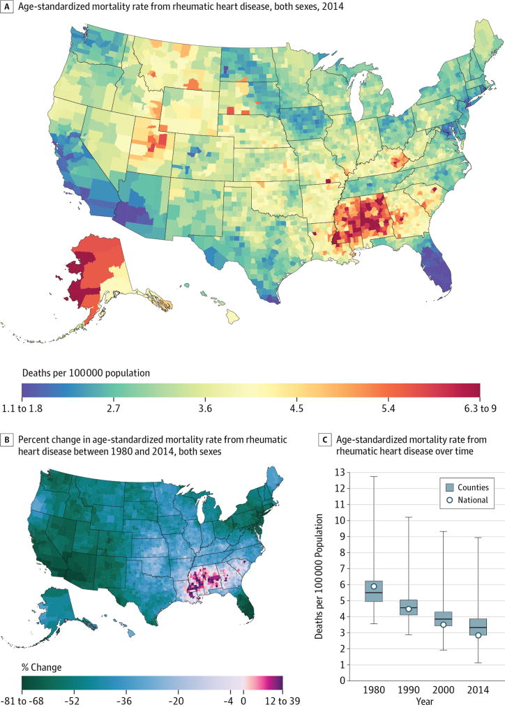 Conclusions and relevance: Substantial differences exist between county ischemic heart disease and stroke mortality rates. Smaller differences exist for diseases of the myocardium, atrial fibrillation, aortic and peripheral arterial disease, rheumatic heart disease, and endocarditis.