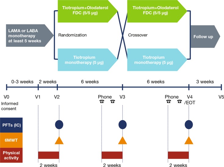 Results: A total of 180 Japanese patients with COPD, aged ≥40 years will be enrolled into the double-blind, multicenter, active-controlled, crossover study (NCT02629965) and will be randomized to receive either tiotropium/olodaterol FDC or tiotropium for 6 weeks each [two puffs via RESPIMAT® (Boehringer Ingelheim, Ingelheim, Germany) inhaler in the morning]. The primary endpoint is IC at rest measured at 60 min post-dose after 6 weeks treatment. The secondary endpoints include the 6-min walk distance (6MWD) at 90 min post-dose and physical activity measured by the activity monitor in the last 2 weeks of the 6-week treatment periods. Lung function tests will also be assessed after 6 weeks treatment. A mixed-effects model repeated measures approach will be used for the primary and secondary endpoints.