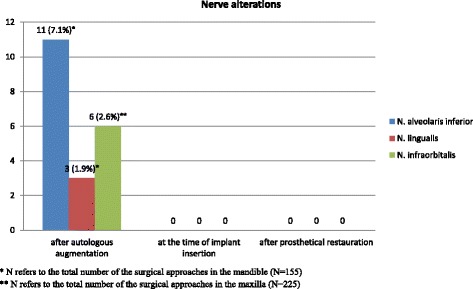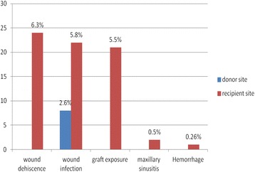 Methods: A consecutive retrospective study was conducted on all patients who were treated at the military outpatient clinic of the Department of Oral and Plastic Maxillofacial Surgery at the military hospital in Ulm (Germany) in the years of 2009 until 2011 with autologous bone transplantation prior to secondary implant insertion. Intraoral donor sites (crista zygomatico-alveolaris, ramus mandible, symphysis mandible, and anterior sinus wall) and extraoral donor site (iliac crest) were used. A total of 279 patients underwent after a healing period of 3-5 months routinely computer tomography scans followed by virtual implant planning. The implants were inserted using guided oral implantation as described by Naziri et al. All records of all the consecutive patients were reviewed according to patient age, history of periodontitis, smoking status, jaw area and dental situation, augmentation method, intra- and postoperative surgical complications, and surgeon's qualifications. Evaluated was the augmentation surgical outcome regarding bone graft loss and early implant loss postoperatively at the time of prosthodontic restauration as well a follow-up period of 2 years after loading.