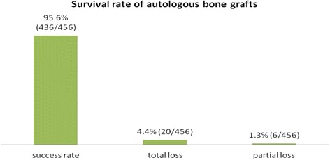 Results: A total of 279 patients underwent 456 autologous augmentation procedures in 546 edentulous areas. One hundred thirteen crista zygomatico-alveolaris grafts, 104 ramus mandible grafts, 11 symphysis grafts, 116 grafts from the anterior superior iliac crest, and 112 sinus lift augmentations with bone scrapes from the anterior facial wall had been performed. There was no drop out or loss of follow-up of any case that had been treated in our clinical center in this 3-year period. Four hundred thirty-six (95.6%) of the bone grafts healed successfully, and 20 grafts (4.4%) in 20 patients had been lost. Fourteen out of 20 patients with total graft failure were secondarily re-augmented, and six patients wished no further harvesting procedure. In the six patients, a partial graft resorption was detected at the time of implantation and additional simultaneous augmentation during implant insertion was necessary. No long-term nerve injury occurred. Five hundred twenty-five out of 546 initially planned implants in 259 patients could be inserted into successfully augmented areas, whereas 21 implants in 20 patients due to graft loss could not be inserted. A final rehabilitation as preplanned with dental implants was possible in 273 of the 279 patients. The early implant failure rate was 0.38% concerning two out of the 525 inserted implants which had to be removed before the prosthodontic restoration. Two implants after iliac crest augmentation were lost within a period of 2 years after loading, concerning a total implant survival rate after 2 years of occlusal loading rate of 99.6% after autologous bone augmentation prior to implant insertion.