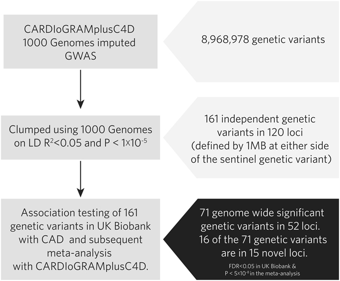 Coronary artery disease (CAD) is the major cause of morbidity and mortality in the world. Identification of novel genetic determinants may provide new opportunities for developing innovative strategies to predict, prevent and treat CAD. Therefore, we meta-analyzed independent genetic variants passing P <× 10-5 in CARDIoGRAMplusC4D with novel data made available by UK Biobank. Of the 161 genetic variants studied, 71 reached genome wide significance (p < 5 × 10-8) including 15 novel loci. These novel loci include multiple genes that are involved in angiogenesis (TGFB1, ITGB5, CDH13 and RHOA) and 2 independent variants in the TGFB1 locus. We also identified SGEF as a candidate gene in one of the novel CAD loci. SGEF was previously suggested as a therapeutic target based on mouse studies. The genetic risk score of CAD predicted recurrent CAD events and cardiovascular mortality. We also identified significant genetic correlations between CAD and other cardiovascular conditions, including heart failure and atrial fibrillation. In conclusion, we substantially increased the number of loci convincingly associated with CAD and provide additional biological and clinical insights.