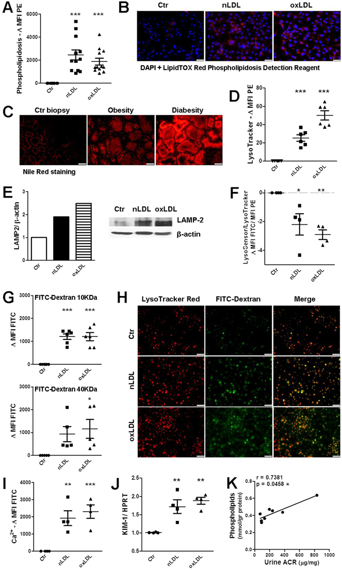 The collateral effects of obesity/metabolic syndrome include inflammation and renal function decline. As renal disease in obesity can occur independently of hypertension and diabetes, other yet undefined causal pathological pathways must be present. Our study elucidate novel pathological pathways of metabolic renal injury through LDL-induced lipotoxicity and metainflammation. Our in vitro and in vivo analysis revealed a direct lipotoxic effect of metabolic overloading on tubular renal cells through a multifaceted mechanism that includes intralysosomal lipid amassing, lysosomal dysfunction, oxidative stress, and tubular dysfunction. The combination of these endogenous metabolic injuries culminated in the activation of the innate immune NLRP3 inflammasome complex. By inhibiting the sirtuin-1/LKB1/AMPK pathway, NLRP3 inflammasome dampened lipid breakdown, thereby worsening the LDL-induced intratubular phospholipid accumulation. Consequently, the presence of NLRP3 exacerbated tubular oxidative stress, mitochondrial damage and malabsorption during overnutrition. Altogether, our data demonstrate a causal link between LDL and tubular damage and the creation of a vicious cycle of excessive nutrients-NLRP3 activation-catabolism inhibition during metabolic kidney injury. Hence, this study strongly highlights the importance of renal epithelium in lipid handling and recognizes the role of NLRP3 as a central hub in metainflammation and immunometabolism in parenchymal non-immune cells.