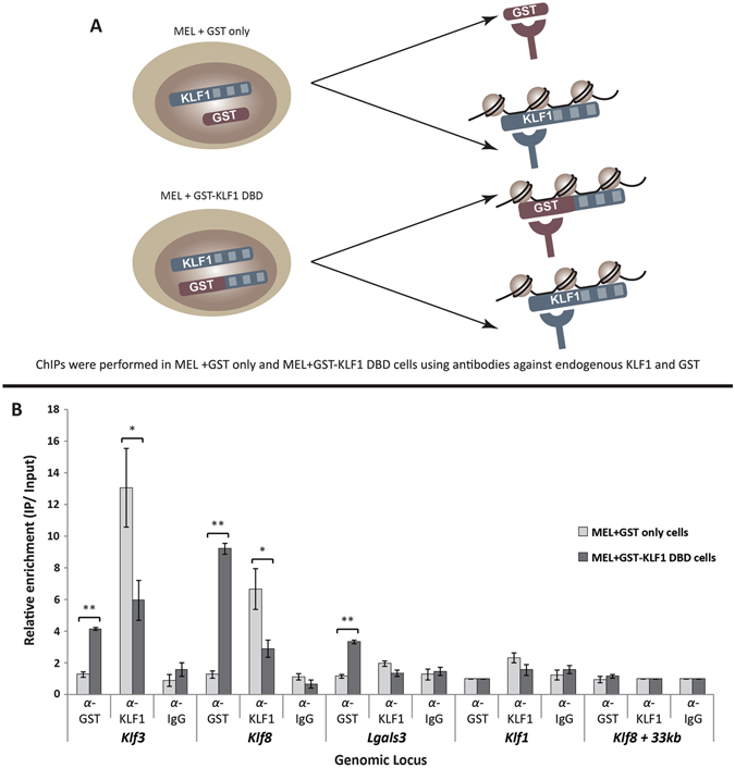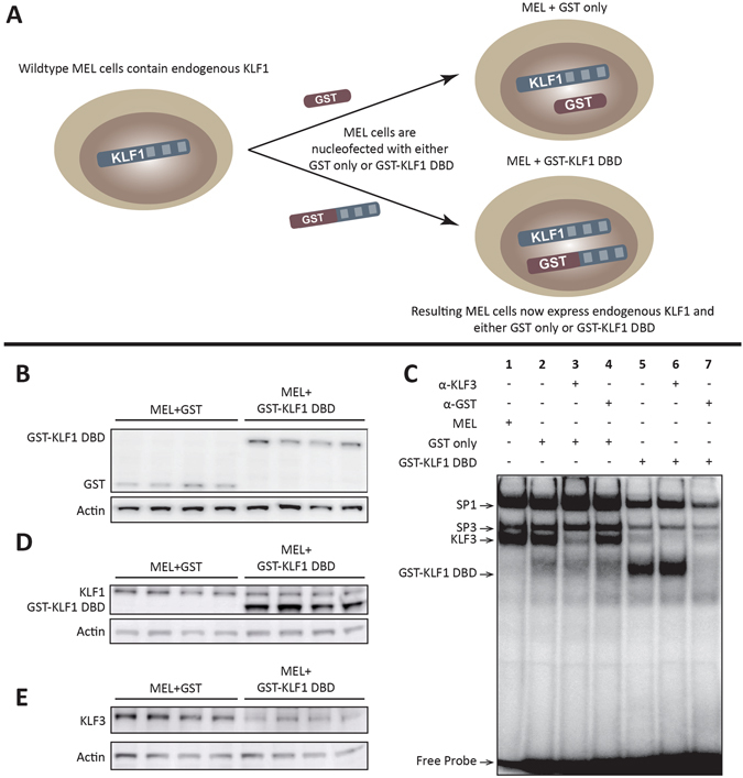 The Krüppel-like factor (KLF) family of transcription factors play critical roles in haematopoiesis. KLF1, the founding member of the family, has been implicated in the control of both erythropoiesis and megakaryopoiesis. Here we describe a novel system using an artificial dominant negative isoform of KLF1 to investigate the role of KLF1 in the erythroid/megakaryocytic switch in vivo. We developed murine cell lines stably overexpressing a GST-KLF1 DNA binding domain fusion protein (GST-KLF1 DBD), as well as lines expressing GST only as a control. Interestingly, overexpression of GST-KLF1 DBD led to an overall reduction in erythroid features and an increase in megakaryocytic features indicative of a reduced function of endogenous KLF1. We simultaneously compared in vivo DNA occupancy of both endogenous KLF1 and GST-KLF1 DBD by ChIP qPCR. Here we found that GST-KLF1 DBD physically displaces endogenous KLF1 at a number of loci, providing novel in vivo evidence of direct competition between DNA binding proteins. These results highlight the role of KLF1 in the erythroid/megakaryocyte switch and suggest that direct competition between transcription factors with similar consensus sequences is an important mechanism in transcriptional regulation.