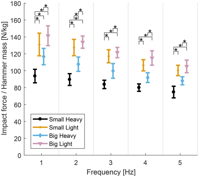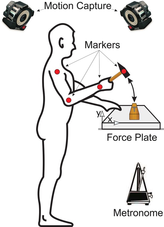While movement is essential to human wellbeing, we are still unable to reproduce the deftness and robustness of human movement in automatons or completely restore function to individuals with many types of motor impairment. To better understand how the human nervous system plans and controls movements, neuromechanists employ simple tasks such as upper extremity reaches and isometric force tasks. However, these simple tasks rarely consider impacts and may not capture aspects of motor control that arise from real-world complexity. Here we compared existing models of motor control with the results of a periodic targeted impact task extended from Bernstein's seminal work: hammering a nail into wood. We recorded impact forces and kinematics from 10 subjects hammering at different frequencies and with hammers with different physical properties (mass and face area). We found few statistical differences in most measures between different types of hammer, demonstrating human robustness to minor changes in dynamics. Because human motor control is thought to obey optimality principles, we also developed a feedforward optimal simulation with a neuromechanically inspired cost function that reproduces the experimental data. However, Fitts' Law, which relates movement time to distance traveled and target size, did not match our experimental data. We therefore propose a new model in which the distance moved is a logarithmic function of the time to move that yields better results (R2 ≥ 0.99 compared to R2 ≥ 0.88). These results support the argument that humans control movement in an optimal way, but suggest that Fitts' Law may not generalize to periodic impact tasks.