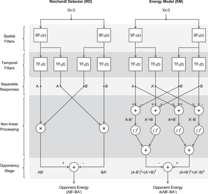 The motion energy model is the standard account of motion detection in animals from beetles to humans. Despite this common basis, we show here that a difference in the early stages of visual processing between mammals and insects leads this model to make radically different behavioural predictions. In insects, early filtering is spatially lowpass, which makes the surprising prediction that motion detection can be impaired by "invisible" noise, i.e. noise at a spatial frequency that elicits no response when presented on its own as a signal. We confirm this prediction using the optomotor response of praying mantis Sphodromantis lineola. This does not occur in mammals, where spatially bandpass early filtering means that linear systems techniques, such as deriving channel sensitivity from masking functions, remain approximately valid. Counter-intuitive effects such as masking by invisible noise may occur in neural circuits wherever a nonlinearity is followed by a difference operation.
