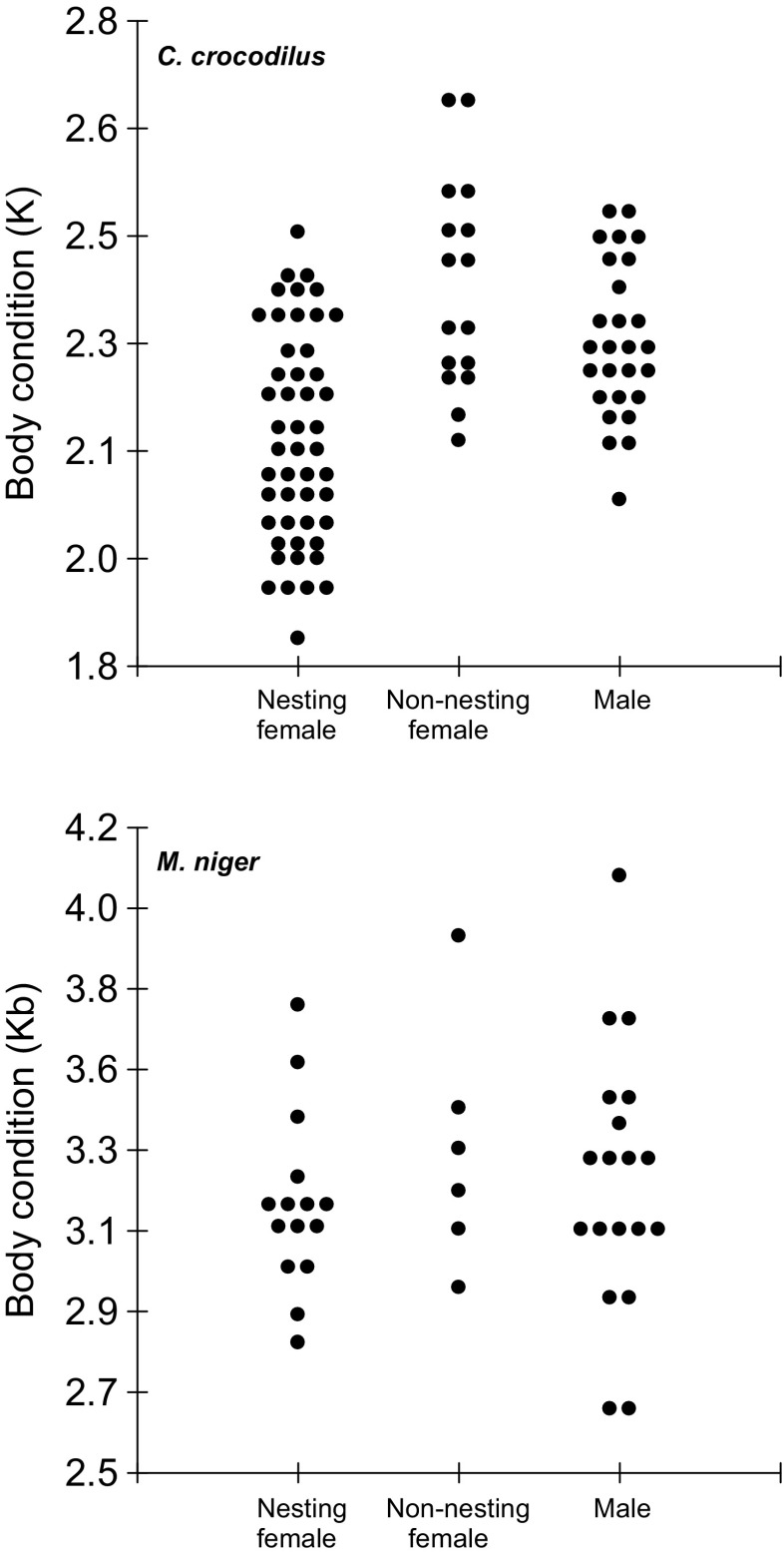 Although nesting ecology is well studied in several crocodilian species, it is not known how nest attendance influences physiology and body condition of nesting females. In this study, we describe body condition and serum biochemical values of nesting female, non-nesting female and male spectacled caiman (Caiman crocodilus) and black caiman (Melanosuchus niger) in two areas of Central Amazonia. We also evaluated the effect of nest age and nest distance to water on body condition and blood parameters of nesting females. Body condition and plasmatic concentrations of glucose, triglycerides, lactate and uric acid of nesting females were significantly different from those of non-nesting females and males in C. crocodilus, but not in M. niger. Our study also demonstrated that nest age and distance to water had a negative effect on female body condition in C. crocodilus, but not in M. niger. Female C. crocodilus attending older nests or nests built further away from permanent water bodies tended to have lower body condition. Our results demonstrate that the nesting strategy of C. crocodilus has a metabolic cost associated with nest attendance for nesting females, which appear to depend on accumulated energetic reserves during nest attendance. In contrast, nest attendance had little effect on the physiology of female M. niger.