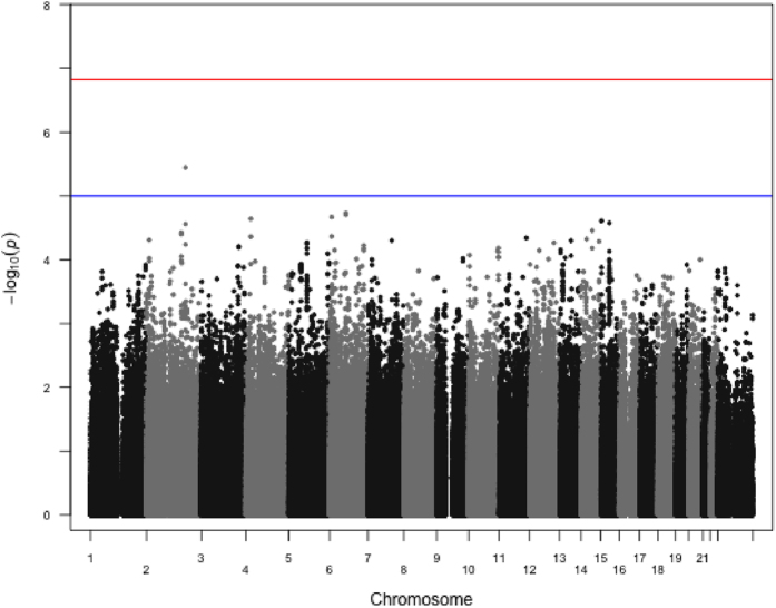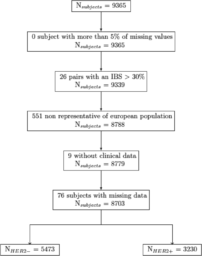Human epidermal growth factor receptor 2-positive breast cancer is a subtype of interest regarding its outcome and the impressive impact of human epidermal growth factor receptor 2 targeted therapy. Constitutional variants may be involved in the aetiology of human epidermal growth factor receptor 2-positive breast cancer, and we propose a case-case study to test the hypothesis that single nucleotide polymorphisms may be associated with human epidermal growth factor receptor 2 status. A Genome-Wide Association Study was used in a cohort of 9836 patients from the SIGNAL/PHARE study (NCT00381901-RECF1098). The main goal was to identify variants specifically related to human epidermal growth factor receptor 2-positive breast cancer. A two-staged genotyping strategy was carried out to cover as large a proportion of the genome as possible. All subjects were genotyped using the Illumina HumanCore Exome chip set. Principal Components Analysis and k-means were then used to characterize the ancestry of the participants. A random sample of subjects from the main "European" cluster was genotyped with the Omni5 chip set. These data were then used to impute missing genotypes from the remaining subjects genotyped only using the HumanCore Exome array. From the 9836 patients, a total of 8703 cases including 3230 patients with human epidermal growth factor receptor 2-positive breast cancer were analyzed. Despite having 80% power to detect an odds ratio of 1.23 in this population, no variant achieved genome-wide significance for association with the occurrence of human epidermal growth factor receptor 2-positive breast cancer vs. any other subtype of breast tumour. Our study was unable to identify constitutional polymorphisms that are strongly associated with human epidermal growth factor receptor 2-positive status among breast cancer patients.
