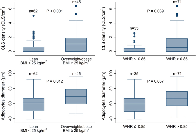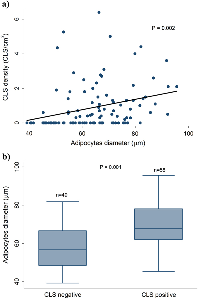 Growing evidence indicates that adiposity is associated with breast cancer risk and negatively affects breast cancer recurrence and survival, a paracrine role of mammary adipose tissue being very likely in this process. In contrast to other adipose depots, occurrence of a sub-inflammatory state of mammary adipose tissue defined by dying adipocytes surrounded by macrophages forming crown-like structures in overweight and obese subjects, remains only partially described. In a general population of breast cancer patients (107 patients) mostly undergoing breast-conserving surgery, we found a positive association between patient's body composition, breast adipocytes size, and presence of crown-like structures in mammary adipose tissue close to the tumor. Overweight (BMI: 25.0-29.9 kg/m2) and obese (BMI ≥ 30.0 kg/m2) patients have 3.2 and 6.9 times higher odds ratio of crown-like structures respectively, compared with normal weight patients. The relatively small increase in adipocyte size in crown-like structures positive vs. negative patients suggests that mammary adipose tissue inflammation might occur early during hypertrophy. Our results further highlight that body mass index is an adequate predictor of the presence of crown-like structures in mammary adipose tissue among postmenopausal women, whereas in premenopausal women truncal fat percentage might be more predictive, suggesting that mammary adipose tissue inflammation is more likely to occur in patients exhibiting visceral obesity. Finally, the presence of crown-like structures was positively associated with systemic markers such as the Triglyceride/High-density lipoprotein-cholesterol ratio serum C-reactive protein and glucose/(HbA1c) glycated Haemoglobin. These compelling results demonstrate that excess adiposity, even in overweight patients, is associated with mammary adipose tissue inflammation, an event that could contribute to breast cancer development and progression.