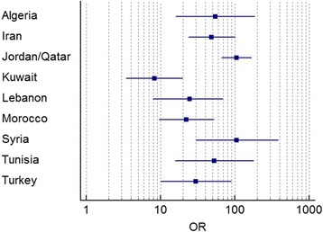 Methods: Studies were included in the analysis if they reported prevalence of HLA-B27 in AxSpA and/or general population and if they covered geographical location in the Middle East or Arab countries in the Mediterranean basin. Odds ratios (OR) were calculated for each country, as a measure of the strength of association between HLA-B27 and AxSpA, compared to the normal population, using the two-by-two frequency table. Available data from the literature were analyzed according to the following quality indicators: sample size, method of HLA-B27 testing, presence of control group and external validity.