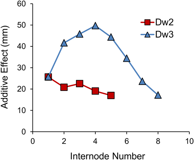 Sorghum is an important C4 grass crop grown for grain, forage, sugar, and bioenergy production. While tall, late flowering landraces are commonly grown in Africa, short early flowering varieties were selected in US grain sorghum breeding programs to reduce lodging and to facilitate machine harvesting. Four loci have been identified that affect stem length (Dw1-Dw4). Subsequent research showed that Dw3 encodes an ABCB1 auxin transporter and Dw1 encodes a highly conserved protein involved in the regulation of cell proliferation. In this study, Dw2 was identified by fine-mapping and further confirmed by sequencing the Dw2 alleles in Dwarf Yellow Milo and Double Dwarf Yellow Milo, the progenitor genotypes where the recessive allele of dw2 originated. The Dw2 locus was determined to correspond to Sobic.006G067700, a gene that encodes a protein kinase that is homologous to KIPK, a member of the AGCVIII subgroup of the AGC protein kinase family in Arabidopsis.