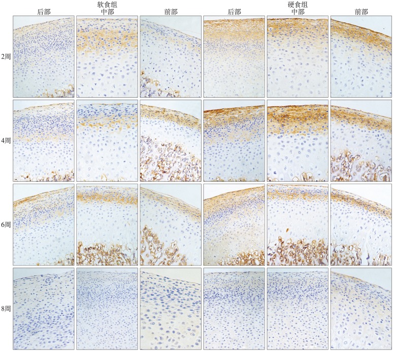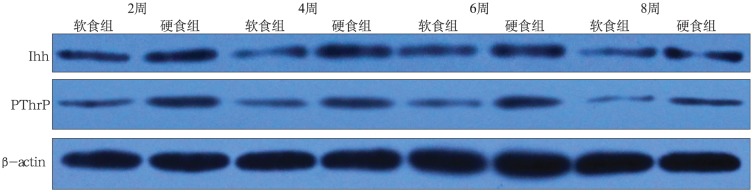 Methods: A total of 48 10-day-old rabbits were randomly divided into two groups and fed different kinds of food, such as solid diet and soft diet. The animals were sacrificed after 2, 4, 6, and 8 weeks. Difference of Ihh and PThrP expression levels induced by altered masticatory loading was tested by hematoxylin-eosin (HE), immunohistochemistry, Western blot, and real-time polymerase chain reaction (PCR).