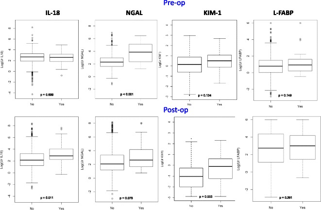 Results: The presence of leukocyte esterase and nitrites on urinalysis was associated with increased urinary NGAL (R2 0.16, p < 0.001 and R2 0.07, p < 0.001, respectively) in pre-operative samples. Hematuria was associated with increased levels of all 4 biomarkers, with a much stronger association seen in post-operative samples (R2 between 0.02 and 0.21). Dipstick proteinuria concentrations correlated with levels of all 4 urinary biomarkers in pre-operative and post-operative samples (R2 between 0.113 and 0.194 in pre-operative and between 0.122 and 0.322 in post-operative samples). Adjusting the AUC of post-operative AKI for dipstick proteinuria lowered the AUC for all 4 biomarkers at the pre-operative time point and for 2 of the 4 biomarkers at the post-operative time point.