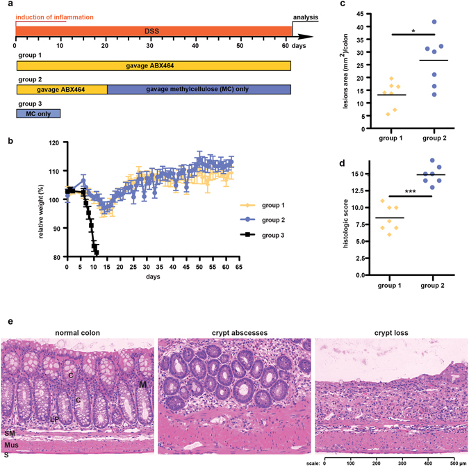 The progression of human immunodeficiency virus (HIV) is associated with mucosal damage in the gastrointestinal (GI) tract. This damage enables bacterial translocation from the gut and leads to subsequent inflammation. Dextran sulfate sodium (DSS-exposure) is an established animal model for experimental colitis that was recently shown to recapitulate the link between GI-tract damage and pathogenic features of SIV infection. The current study tested the protective properties of ABX464, a first-in-class anti-HIV drug candidate currently in phase II clinical trials. ABX464 treatment strongly attenuated DSS-induced colitis in mice and produced a long-term protection against prolonged DSS-exposure after drug cessation. Consistently, ABX464 reduced the colonic production of the inflammatory cytokines IL-6 and TNFα as well as that of the chemoattractant MCP-1. However, RNA profiling analysis revealed the capacity of ABX464 to induce the expression of IL-22, a cytokine involved in colitis tissue repair, both in DSS-treated mice and in LPS-stimulated bone marrow-derived macrophages. Importantly, anti-IL-22 antibodies significantly reduced the protective effect of ABX464 on colitis in DSS-treated mice. Because reduced IL-22 production in the gut mucosa is an established factor of HIV and DSS-induced immunopathogenesis, our data suggest that the anti-inflammatory properties of ABX464 warrant exploration in both HIV and inflammatory ulcerative colitis (UC) disease.